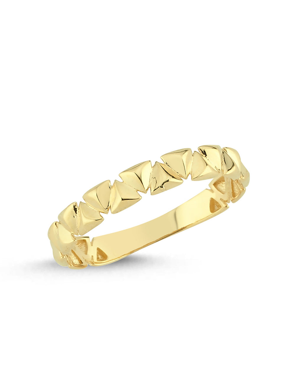 Geometrik zarafeti modern bir çizgiyle buluşturan TriLine Modern Altın Yüzük, yan yana dizilmiş üçgen formuyla sofistike ve minimalist bir şıklık sunar. Altının parlak yüzeyi üçgenlerin keskin hatlarını öne çıkararak güçlü bir duruş yaratır.